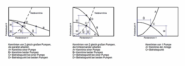 Die Kennlinie einer Kreiselpumpe beschreibt den Zusammenhang zwischen Druckerhöhung und Fördermenge. Der höchste Druck ist bei einer Kreiselpumpe bei der Fördermenge Null erzeugt. Dies ist der Fall, wenn die Pumpe gegen einen geschlossenen Schieber fördert. Kombiniert mit der Kennlinie des angeschlossenen Rohrnetzes ergibt sich der Arbeitspunkt als Schnittpunkt von Pumpen- und Rohrnetzkennlinie. Um eine Erhöhung des Förderdruckes zu erreichen, können mehrere Kreiselpumpen hintereinandergeschaltet werden. Somit addiert sich der Förderdruck und durch Parallelschaltung die erzielbare Fördermenge. Drehzahländerungen der Pumpen verändern Fördermenge und Druck und beeinflussen somit die Leistungsaufnahme.